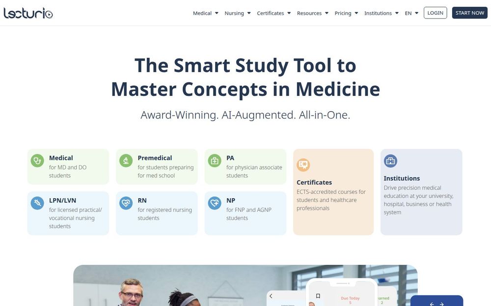 Lecturio 是一家专注于医学与护理教育的在线学习平台,致力于通过视频讲座、题库、学习路径与临床模拟等工具,帮助学生和医疗机构实现知识掌握与临床决策能力的提升。平台强调循证教学法与学习科学,覆盖从预科到专业阶段的多种课程,并提供针对院校与医院的集成解决方案。