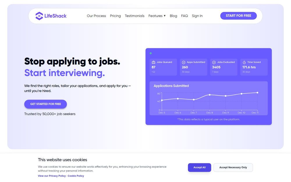 LifeShack 是一款面向求职者的 AI 驱动求职自动化平台,目标是替用户完成职位发现、个性化材料生成与批量投递等繁琐流程,从而让求职者将更多精力放在面试准备与技能提升上。平台通过订阅模式提供不同层级的服务(包括免费试用、月付与季度优惠),并宣称拥有可观的成功案例与用户口碑。
