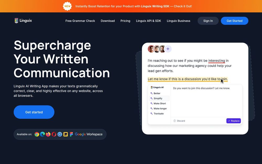 Linguix 是一款基于人工智能的写作辅助产品,主要通过浏览器扩展和在线编辑器为个人与团队提供语法校对、拼写检查与写作建议。它支持在 Gmail、Google Docs、Canva 等数百万网站上实时工作,兼容多种主流浏览器。Linguix 不仅关注单句的语法准确性,还提供内容质量评分与团队管理功能,方便企业统一沟通风格并监测写作表现。