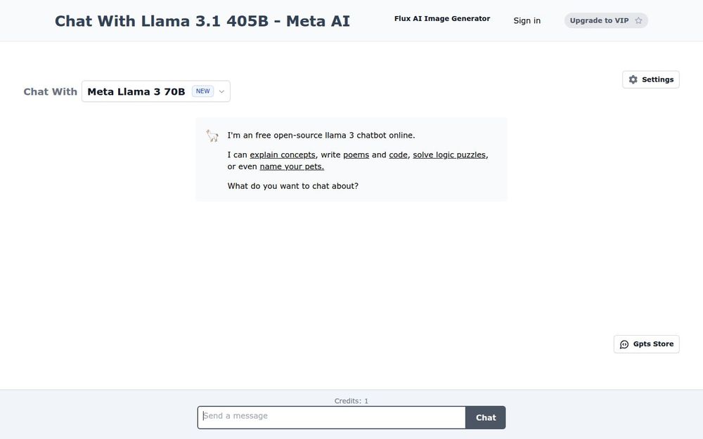 Llama 3 是 Meta AI 推出的开源大型语言模型家族,通过网页聊天接口提供在线体验。该站点展示了基于 Llama 3 的聊天机器人实现(包括 Llama 3.1 405B 与 Llama 3 70B 等模型变体),面向普通用户和开发者,旨在让人们以低门槛的方式体验强大的生成式能力。界面简洁,支持自然语言对话,能够完成知识解释、创作、编程和问题求解等任务。