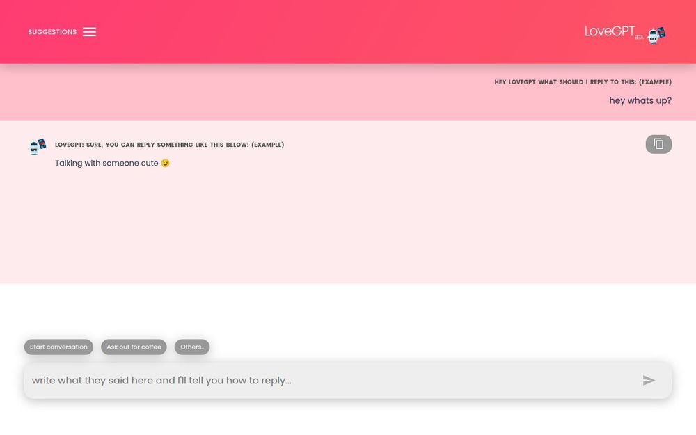 LoveGPT 是一款基于 AI 会话模型的情感交流辅助产品,旨在为用户提供针对恋爱、约会和日常情感沟通的即时回复建议与话题引导。无论是开启对话、维持聊天热度、提出邀约,还是化解尴尬局面,LoveGPT 都能根据输入的对话片段或情境提示,生成多种风格和语气的候选回复,帮助用户更从容地与他人互动。