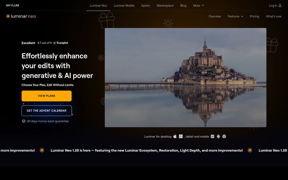 Luminar Neo 是 Skylum 推出的一款以人工智能为驱动的现代化照片编辑器,面向从业余摄影爱好者到专业创作者。它整合了直观的界面与强大的 AI 工具,支持桌面(macOS/Windows)与移动端的跨设备工作流(Luminar Ecosystem),并以一次购买的终身许可或灵活订阅的方式提供给用户。软件强调本地处理以保证 隐私安全,同时兼顾性能与可扩展性,适配多种原始(RAW)与常见图像格式。