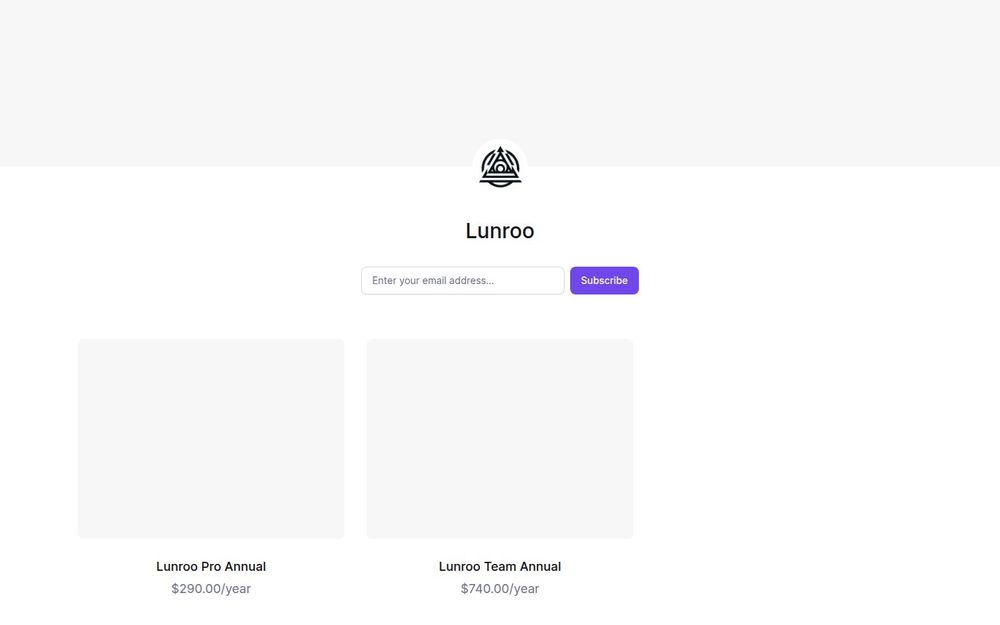 Lunroo 是在 LemonSqueezy 平台上销售的订阅型产品品牌,提供至少两个年度订阅计划:Lunroo Pro Annual 和 Lunroo Team Annual。页面展示了两种年付定价($290/年 与 $740/年),表明产品采用按年收费的订阅模式,并区分面向个人专业用户与面向团队或企业用户的授权层级。页面虽简洁,但可以看出其以长期订阅和团队扩展为核心定位。