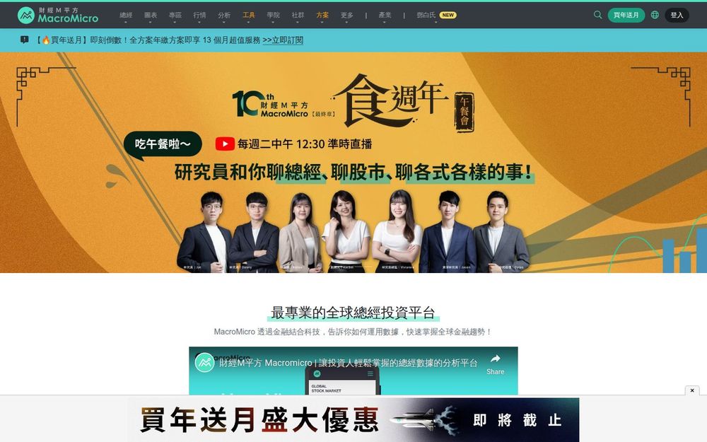 MacroMicro(財經M平方)是一個結合金融與科技的總經研究平台,目標是用數據驅動的圖表與指標協助投資人理解全球經濟循環與市場位置。平台強調「循環為主、數據為輔」,提供大量可視化圖表、主題報告與教學內容,讓使用者能從基本面出發,建立系統性的投資決策流程。