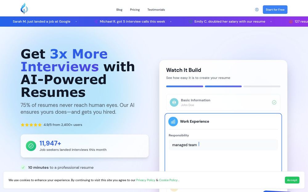 AI 内容生成与强化: 平台会将用户输入的工作经历、项目与技能自动重写为更具影响力的成就导向描述,使用招聘经理和 ATS 喜欢的表达方式。