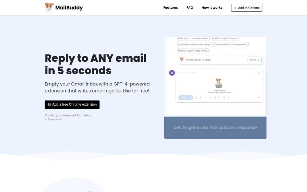 MailBuddy 是一款为 Gmail 设计的 Chrome 扩展,旨在用 AI 加速回复邮件流程。它宣称能够在“5 秒内”根据上下文生成回复,支持用户通过简单指令调整语气与格式,直接在回复框内展示生成内容,用户可审阅、编辑后再发送。该产品页面同时提及 GPT‑4 与 GPT‑3.5,强调即开即用、无需额外训练或复杂设置,并且提供永久免费使用的承诺。
