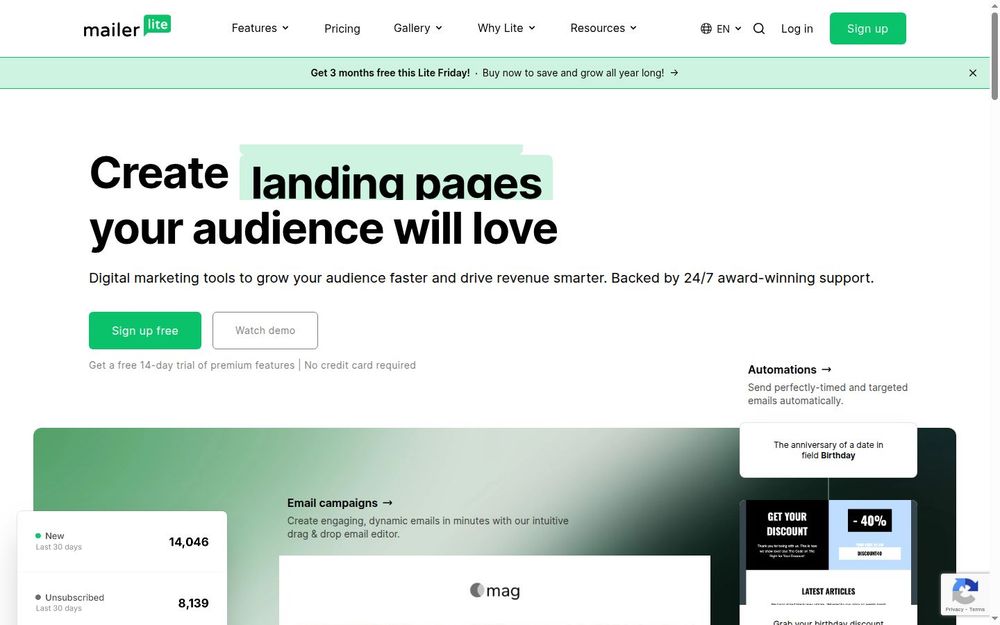 - 自动化: MailerLite 提供强大的自动化功能,用户可以设置定时和目标明确的电子邮件发送,确保信息在最佳时机送达受众。