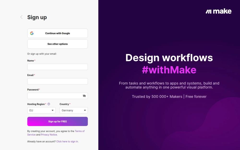 Make 是一款以可视化工作流为核心的自动化平台,帮助用户在不同应用和服务之间实现数据流转与任务自动化。注册流程提供多种登录方式(例如 Google/Apple/Facebook/GitHub),也支持通过邮箱手动注册。注册时需选择 托管区域(EU 或 US) 与所在国家,并遵守平台的 服务条款与隐私政策。同时页面集成 reCAPTCHA 提高安全性,密码策略要求强度较高以确保账户安全。