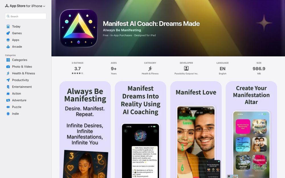 应用由 Possibility Outpost Inc. 发布,隐私政策与服务条款在应用页面与开发者站点可见。隐私声明显示可能收集联结个人的数据(如联系信息、使用数据与用户内容)与非联结数据。Manifest AI Coach 兼容 iPhone、iPad、Mac 与 Apple Vision(需对应系统版本),并提供内购选项,包括一次性终身付费与订阅式产品。