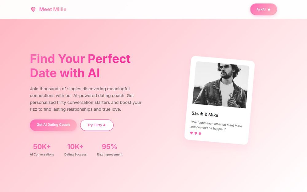 Meet Millie 是一个面向现代恋爱场景的 AI 驱动平台,旨在将人工智能与成熟的约会心理学相结合,帮助用户在真实互动中取得更好效果。平台主打个性化辅导与对话生成,并通过数据和成功案例展现效果,适合希望提升社交能力、克服聊天尴尬或找到长期伴侣的用户。
