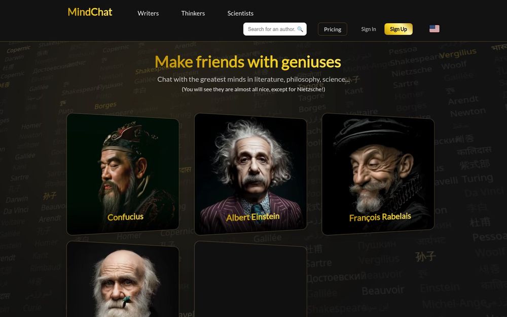 丰富的人物库: 平台拥有超过 100+ 精神化身,从古希腊哲学家到现代作家与科学家,覆盖多学科与多文化背景。