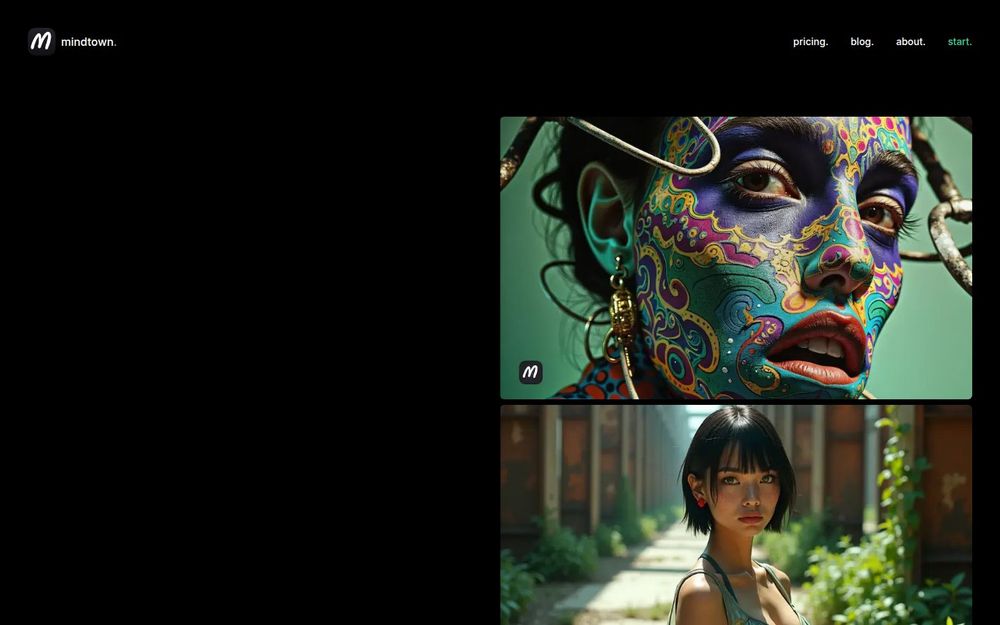 Mindtown 是一个面向创意表达与视觉探索的在线平台,网站口号为“explore your creativity / expand your imagination”。从首页布局可以看到丰富的视觉示例与快速入口:注册/开始使用、定价、博客与关于页,以及面向社区的邀请(Discord)和社交媒体(X),并提供邮箱支持。整体侧重于帮助用户通过网页应用快速进入创作流程并分享成果。