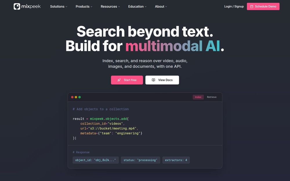 如果你的产品或团队需要把海量视频、音频或图像与文档变成可执行的语义信息(例如视频片段检索、品牌安全筛查、视觉商品搜索或法律合规检索),Mixpeek 提供了一套完整、可扩展且面向开发者的工具链。它把跨模态索引、低延迟检索与与 LLM/agent 的无缝集成结合起来,能显著缩短从数据接入到可用检索能力的工程周期。