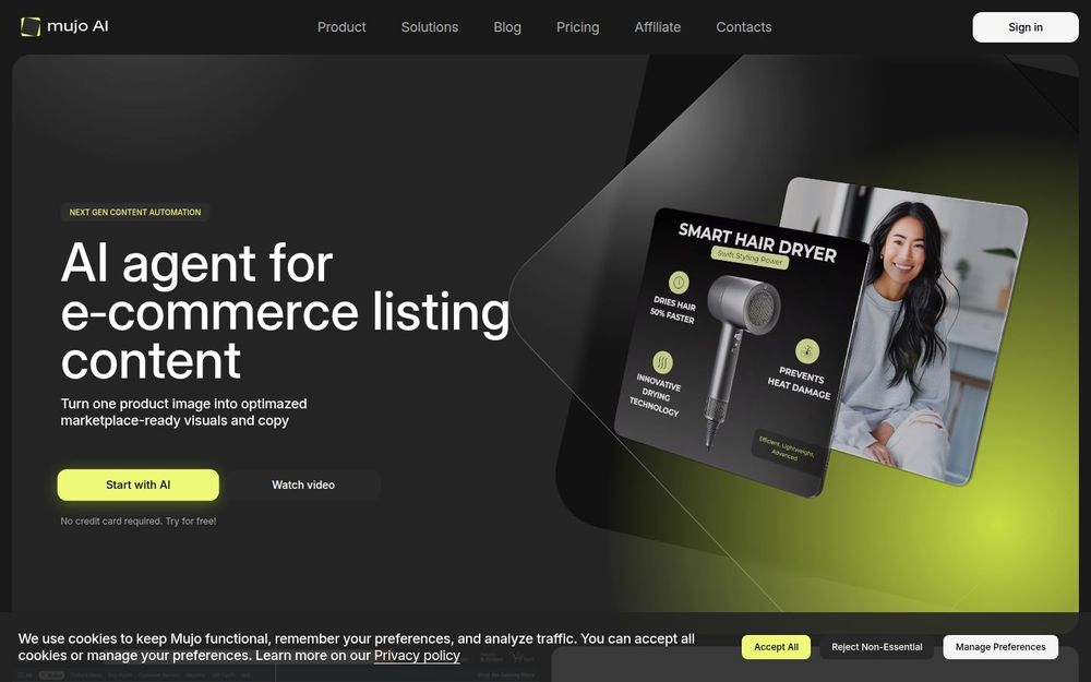 Mujo AI 是为电商商品上架设计的内容自动化平台。它把“从一张产品图到完整上市素材”的流程自动化:上传单张照片后,系统会生成经过优化的图片画廊与可直接使用的标题、要点与商品描述,兼顾各大平台的规格与算法偏好,旨在提高曝光与转化,降低退货与人工成本。