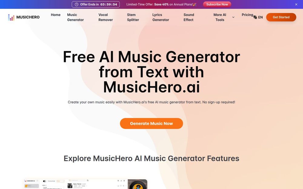 访问 MusicHero 网站并点击“Generate Music/生成音乐”,无需注册即可开始创作。
