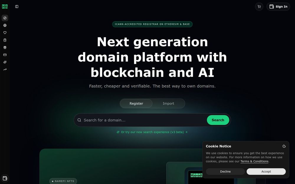 Namefi 是一个将传统域名生态与区块链技术结合的域名平台,支持在以太坊与 Base 上操作,并且为 ICANN 认证的注册商。它通过将 DNS 名称代币化为 Namefi NFT 的方式,把域名所有权从中心化记录转为链上可验证的资产,从而实现更快的转移、更明确的溯源与市场流通能力。平台还集成了 AI 品牌生成器与便捷的 DNS 管理工具,面向域名持有者、品牌设计师与 Web3 项目团队。
