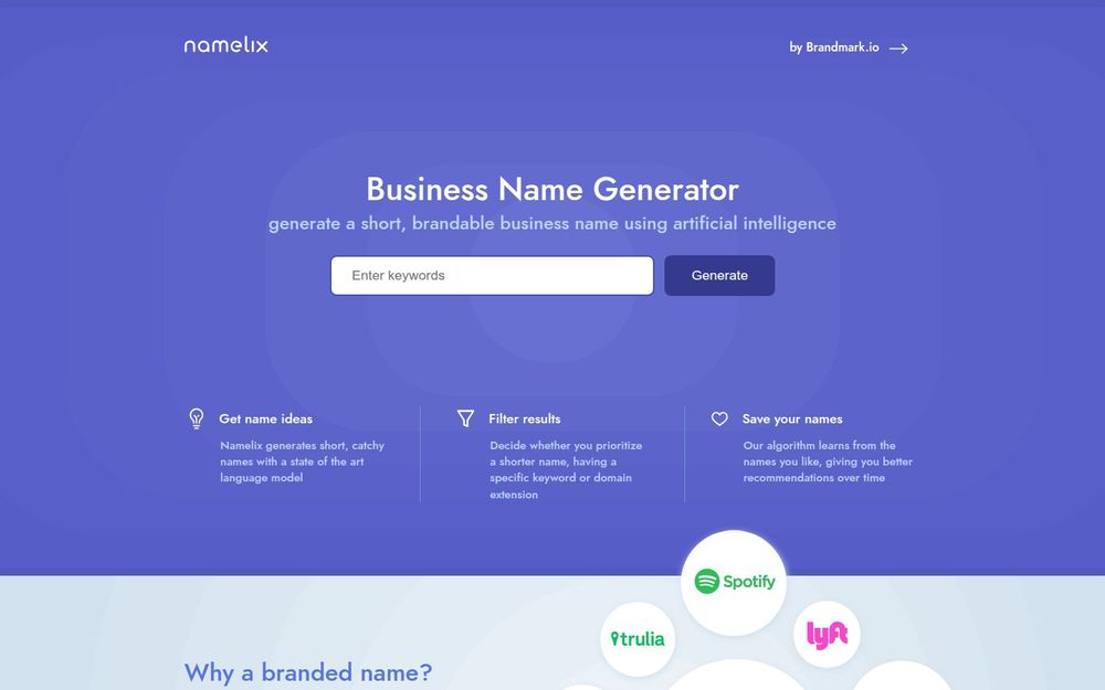 Namelix 是一款基于 人工智能 的商业名称生成工具,针对需要短小、易记和具品牌感名称的创业者与公司而设计。它通过先进的语言模型自动生成大量候选名称,并提供筛选和保存功能,帮助用户在众多选项中快速找到适合自身定位的品牌词。Namelix 的目标是将复杂的命名过程简化为几步交互,并结合域名可用性和美学偏好,提高品牌命名效率。