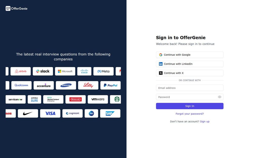 OfferGenie 是一个聚焦面试准备的在线平台,强调将真实公司面试题与 AI 助手结合,旨在帮助求职者更高效地准备技术与行为面试。主页直接展示了“最新真实面试题目”和“AI 驱动的面试助理”这两大核心卖点,并提供便捷的账号登录入口,让用户能快速进入个性化练习环境。