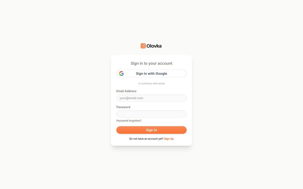 Olovka 是一个以用户认证和账户管理为核心的界面组件/服务,页面设计简洁直观,主要用于为应用提供登录、注册以及密码找回等功能。页面显示了通过 Google 登录 的快捷入口以及传统的 电子邮件+密码 登录方式,并包含明显的注册与密码重置链接,适合作为现有应用的身份验证入口或独立的认证模块。