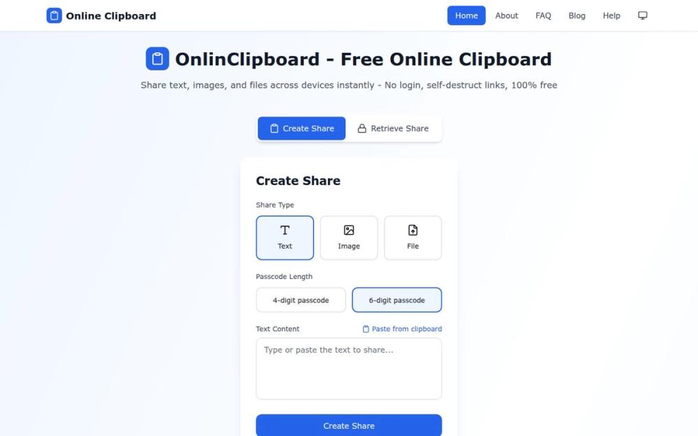 OnlinClipboard 是一款面向跨设备、临时分享场景的免费在线剪贴板服务。它允许用户在无需注册的情况下,快速创建包含文本、图片或文件的临时分享链接,并可选择设置 4 或 6 位数字访问密码以增加一层验证。分享内容在被检索后会立即自毁,或在 24 小时后自动删除,适用于一次性敏感信息传递或临时文件传输。