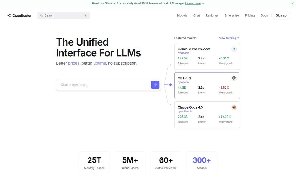 平台还提供模型目录、排行榜与“State of AI” 报告等洞察,帮助用户了解模型使用趋势与行业实践。