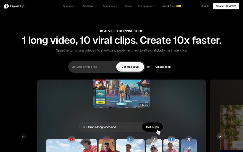 - 智能剪辑: OpusClip 利用 AI 技术自动识别视频中的精彩瞬间,用户只需上传视频,系统便会自动生成短视频。