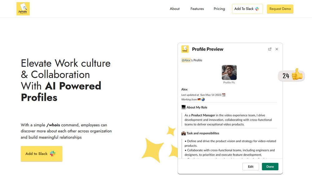 OrgEngage 的 Profile For Slack 是一款为远程与分布式团队设计的AI 驱动员工画像与协作增强工具。通过与 Slack 无缝集成,员工只需使用 /whois 指令就能查看、创建或更新同事的个人与工作信息,从而快速建立联系、缩短新人入职适应期并提高团队协作效率。产品强调包容性与归属感,帮助组织在缺乏面对面交流的环境中打造更具温度的工作文化。