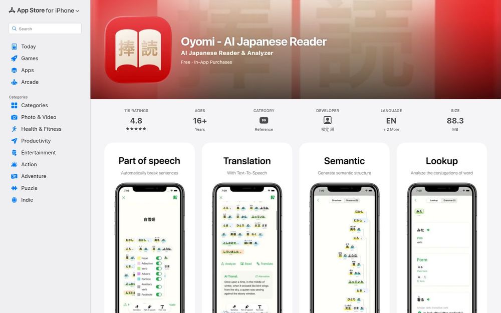 Oyomi 是一款基于机器学习和 AI 技术的日语阅读与语法分析应用,旨在提升日语阅读效率与理解深度。它不仅能将句子自动拆分并标注词性与汉字发音,还能进行语义结构分析、在线翻译与语音朗读,支持网页与电子书的导入与解析,适合在学习、阅读与资料研究等多种场景下使用。