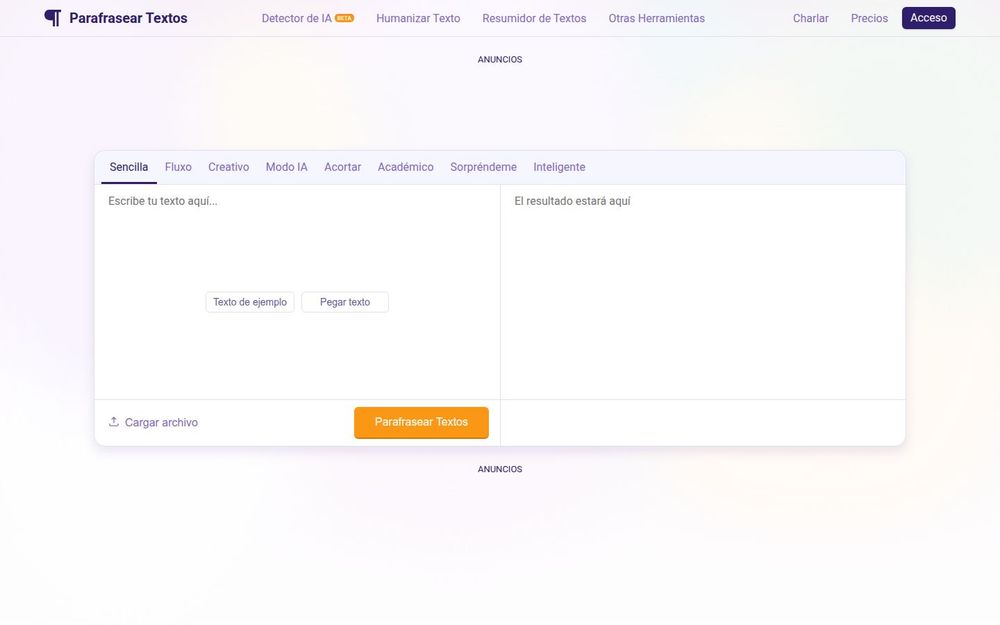 多模式改写(8 种模式): 包含 Sencilla(简单)、Fluxo(流畅)、Creativo(创意)、Modo IA(智能)、Acortar(缩短)、Académico(学术)、Sorpréndeme(惊喜) 等,可按用途选择不同策略,部分高级模式为付费解锁。