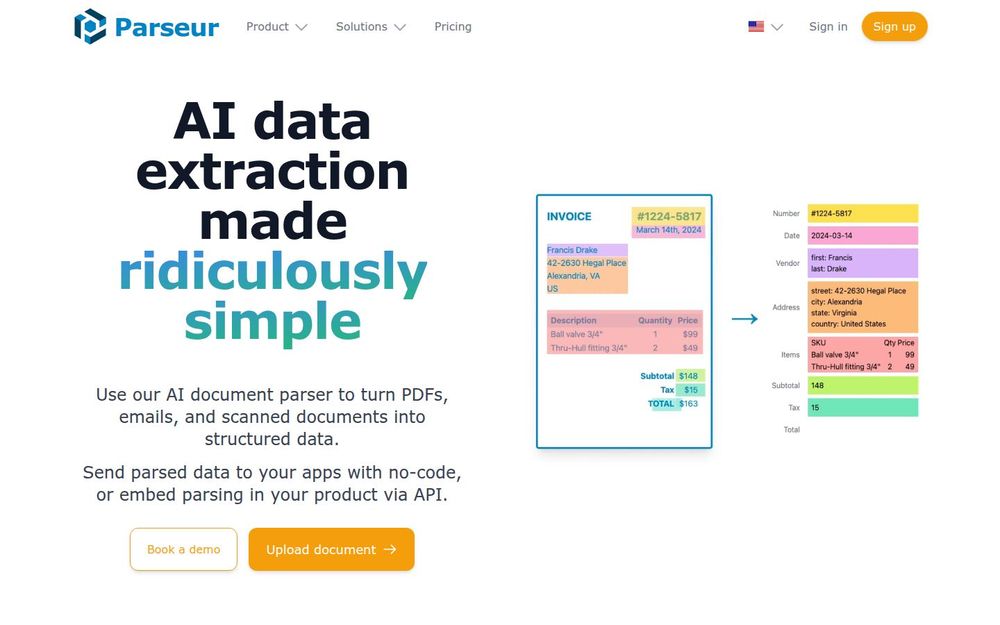 Parseur 是一款面向企业的智能文档解析与数据抽取平台,旨在将各种非结构化文档(如电子邮件、PDF、扫描件、图片和 HTML)自动转为可复用的结构化数据。它通过AI 引擎结合多种 OCR 与模板化工具,支持零代码上手,同时为需要更深度集成的团队提供完善的 API 与 webhook。Parseur 强调易用性、可扩展性与合规安全,适合财务、物流、房地产、医疗、电商等需要大量文档处理的行业。