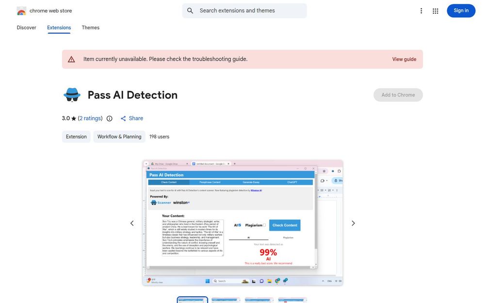 Pass AI Detection 是一款在 Chrome 网上应用店上架的扩展,定位为集AI 内容检测、改写(humanize)和自动写作于一体的工具。其主页宣称这是“完全免费的 AI 抄袭扫描器、AI 证伪改写器与论文生成器”,并支持在弹出窗口中使用 ChatGPT(GPT-3 / GPT-4)以增强写作体验。当前条目显示用户量有限(约 198 人),评分为 3.0(来自 2 条评分),且页面存在“Item currently unavailable”的提示,建议在安装前查看故障排查指南。