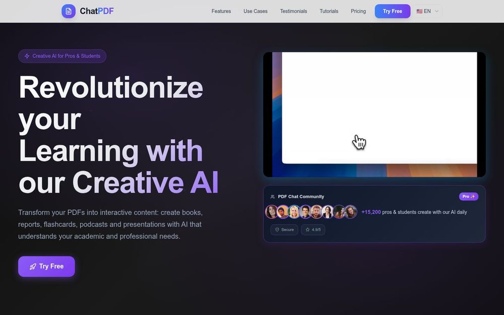 PDF-Glamzn(GLAMZN)是一款以创意型 AI 驱动的 PDF 处理平台,旨在将静态文档转化为交互式学习与工作内容。无论你是学生需要高效复习、研究人员要生成综述书籍,还是职场人士需制作可演示的报告与培训材料,PDF-Glamzn 都提供从文档解析到多形式输出的一站式解决方案。产品主打易用性、跨语言支持以及对学术与专业引用的严格追踪,帮助用户把碎片化信息组织为结构化知识。