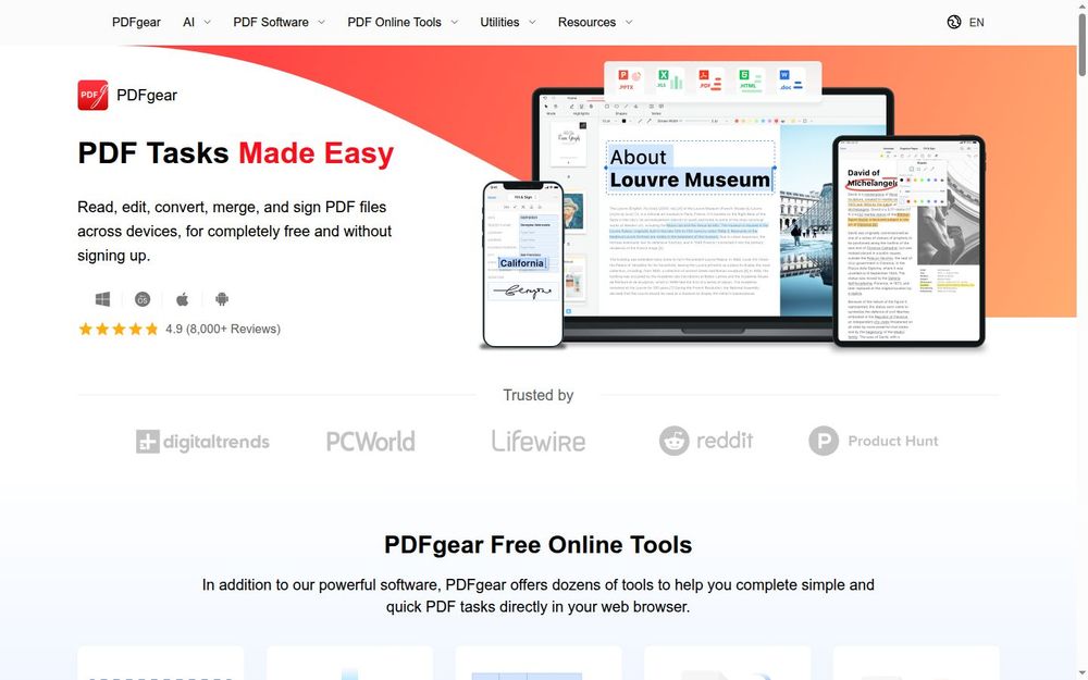 PDFgear 是一款免费的 PDF 编辑软件,旨在为用户提供高效、便捷的 PDF 文件处理体验。无论是阅读、编辑、转换还是签署 PDF 文件,PDFgear 都能轻松应对。它支持多种平台,包括 Windows、macOS、iOS 和 Android,用户可以随时随地访问和管理他们的 PDF 文件。