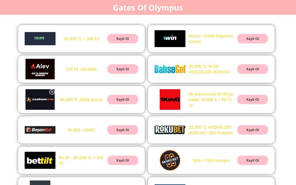 PenParrot 是一个面向在线博彩玩家的资讯与优惠聚合平台,页面同时包含对知名老虎机游戏 Gates of Olympus 的详尽介绍和多家赌场平台的注册福利展示。该页面以土耳其玩家为主要受众,列出了包括注册赠金、免费旋转和存款奖励在内的多种促销信息,并提供对游戏机制、图形表现与玩法策略的解读,帮助玩家在选择平台与玩法时做出更明智的判断。
