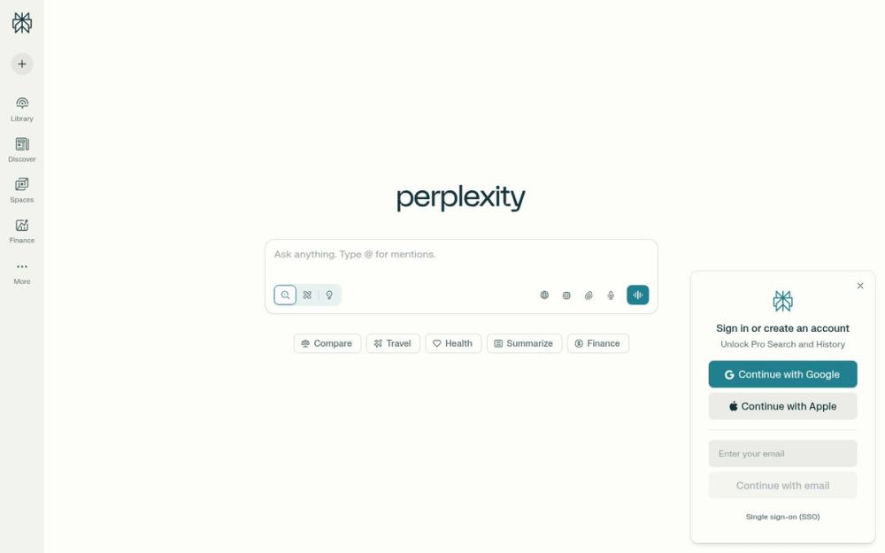 Perplexity 是一个面向问答与信息检索的智能平台,融合了大语言模型与实时网络检索能力,旨在为用户提供快速、可核查且结构化的答案。它既适合日常提问,也适合专业研究、学习和事实核查场景。界面以“Ask anything”为核心交互,配套 Library、Discover、Spaces、Finance 等模块,便于用户分类管理与深度探索。