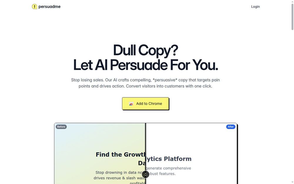 PersuadMe 是一款面向营销和产品团队的 AI 助手,以 Chrome 扩展形式运行,旨在将平淡的网页文案转换为更具说服力的销售文案。它通过分析页面可见文本,结合选择的说服模式与语气,实时生成替代文本供用户预览并复制到自己的网站或编辑器中。产品强调实用性与伦理性,既追求转化效果,也注重不误导用户。