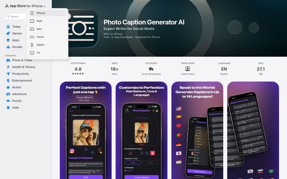 PhotoCaption AI(曾用名 Photo Caption Generator AI)是一款面向社交媒体用户的照片标题与文案生成应用。应用利用 GPT-4 Vision 对图片进行智能分析,自动生成适配不同平台和风格的短文案、标签与可选的 ALT 文本,旨在帮助用户节省文案构思时间、提升内容吸引力并扩展跨语言传播能力。该应用仅在 iPhone 上运行,要求 iOS 17.1 或更高版本,同时也列出对 Mac 和 Apple Vision 的兼容性与版本要求。