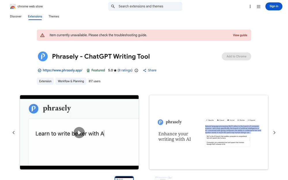 当前扩展在 Chrome 商店中的条目显示“Item currently unavailable”,可能存在可用性或区域限制问题,安装前建议查看开发者网站或故障排查指南。