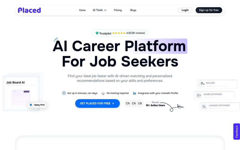 Placed 是一款以 AI 驱动 的求职自动化平台,面向希望提高求职效率和成功率的个人用户。它将简历优化、自动投递、面试训练和个人品牌构建集成在一个产品中,支持与 LinkedIn 同步并承诺短时间内完成设置,适合不想手动重复投简历或希望通过数据驱动提升面试率的求职者。
