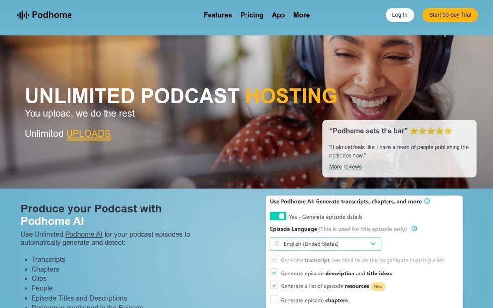 Podhome 非常适合希望把繁杂发布流程交给平台处理的播客创作者。其 Podhome AI 能显著减少剪辑与元数据编辑的工作量,从而让创作者专注于内容创作;自动生成的网站和内建的支持页面则便于品牌展示与变现;详细的分析数据帮助你了解听众行为并做出针对性优化。此外,支持 Podcasting 2.0 的现代功能与一站式分发能力,使 Podhome 成为个体创作者、小型网络乃至新兴播客项目的实用选择。