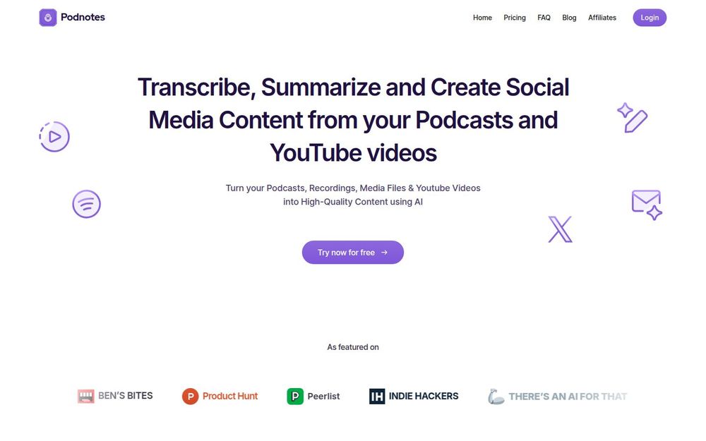 Podnotes 是一款专为播客、音频与视频创作者设计的 AI 助手,旨在将长时长音视频内容高效地转化为可发布的文字与社交素材。用户可以通过粘贴 YouTube 链接、导入 RSS 节目或上传媒体文件,快速获得转录文本、摘要、章节、时间戳以及区分说话人的稿件。平台提供免费试用分钟数并有多种按需订阅方案,适用于个人创作者、团队与代理机构。