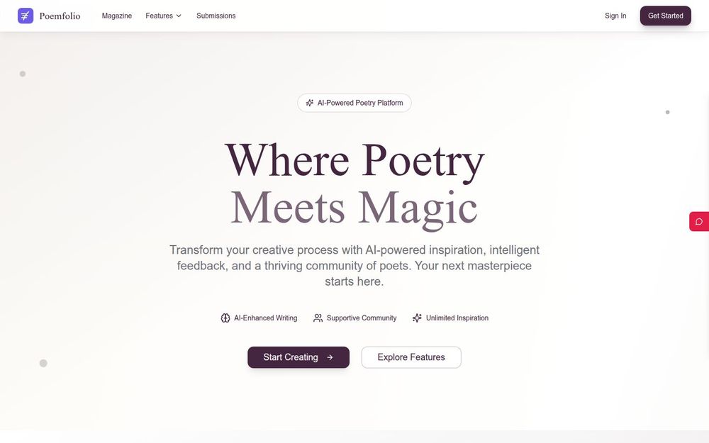 Poemfolio 是一款面向诗歌创作者的综合性平台,将 人工智能(AI)创意生成、写作辅导 与 社区工作坊 有机结合,覆盖从灵感启发到最终出版的全流程。平台以简洁直观的界面为基础,支持多人协作与实时编辑,旨在降低写作门槛、提升审稿效率并帮助诗人系统化管理创作档案。
