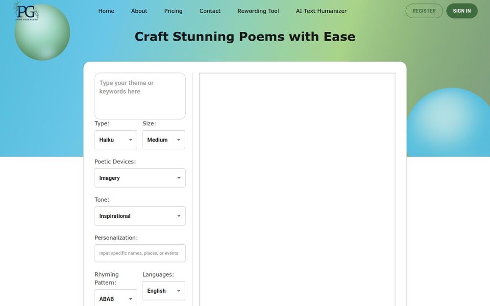 - 高级 AI 驱动: 基于机器学习的文本生成引擎,能够在不要求用户掌握押韵或音节计算的情况下,产出富有意象和语感的诗句。