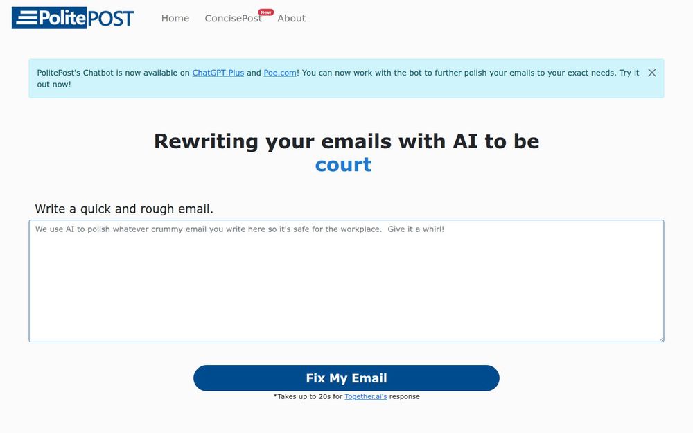 PolitePost 是一款面向职场沟通的 AI 邮件润色工具,核心目标是将用户的草稿或快速写就的邮件转化为适合工作场合的正式与礼貌表达。使用者可以直接粘贴或输入粗略的邮件内容,点击“Fix My Email”后由后台的 AI 模型进行重写与优化。该服务同时提供聊天机器人,已在 ChatGPT Plus 与 Poe 平台上线,以便用户在不同环境中与机器人交互,按需微调邮件风格与语气。