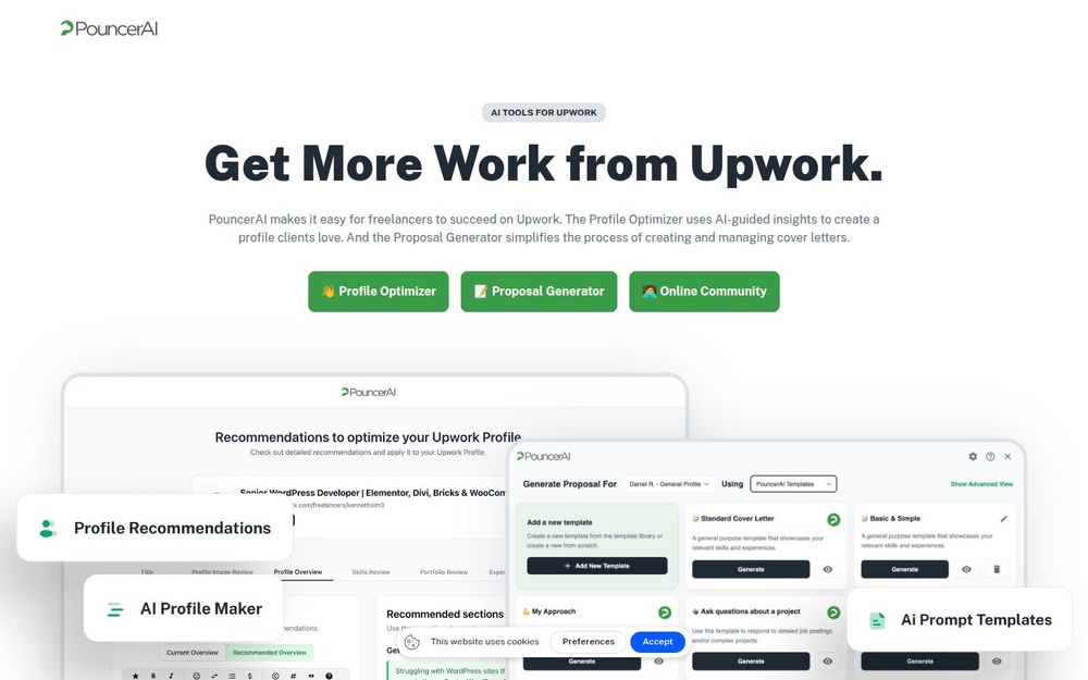 PouncerAI 是专为 Upwork 自由职业者设计的 AI 辅助工具,目标是让寻找项目与提交提案变得更高效、更专业。通过将 AI 生成文本、模板化管理与与 Upwork 的集成相结合,PouncerAI 帮助用户把普通的 Upwork 资料和投标信转化为更具吸引力的展示,从而提高邀请率与成交率。