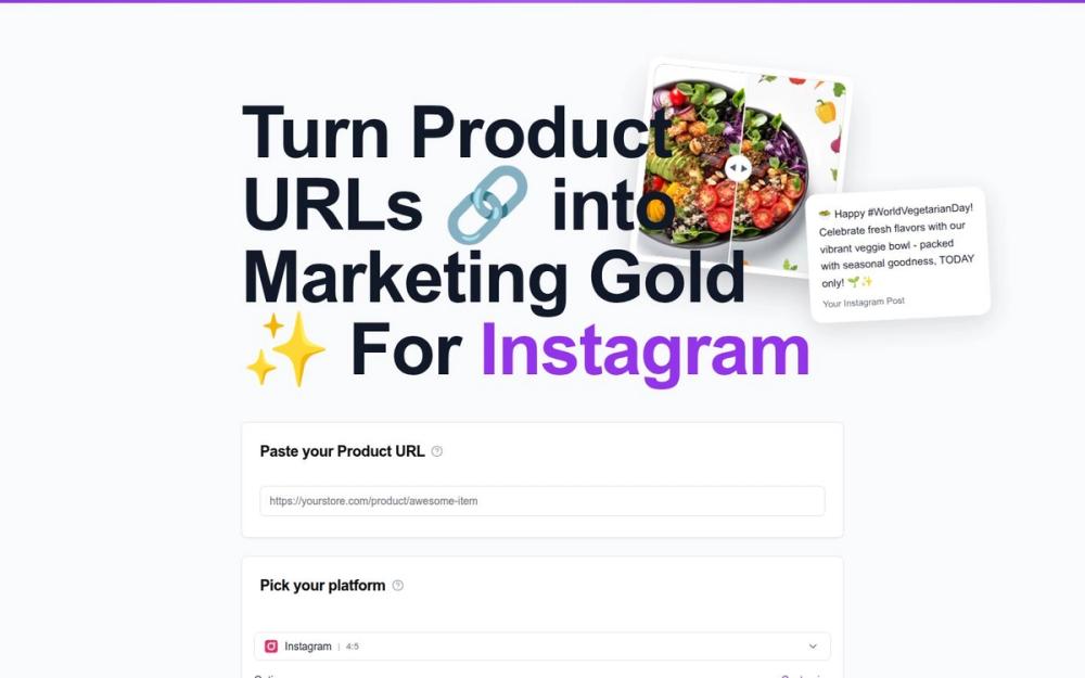 Product Post Generator是一款以 URL 为输入、以社交媒体营销贴文为输出的自动化工具。它的目标是将繁琐的产品文案与视觉准备流程简化为几步操作:粘贴产品链接、自动提取商品信息、选择目标节日或活动,然后生成一组可直接发布或进一步定制的社媒贴文建议与配图预览。该工具适配多种社交平台与常用纵横比,致力于帮助商家提高发布效率和转化率。