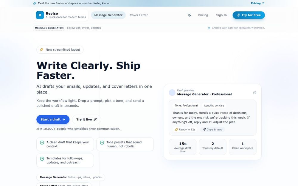 Reviso 是一款集 AI 文本生成、Excel 公式构建 与 文本润色 于一体的在线工具,旨在帮助职场人士、数据分析师和内容创作者提升书面沟通效率。它通过预设模板、语气选择与智能建议,将繁琐的写作和公式编写过程简化为几步操作,支持多语言输出与实时预览,提供免费工具以便用户快速上手。