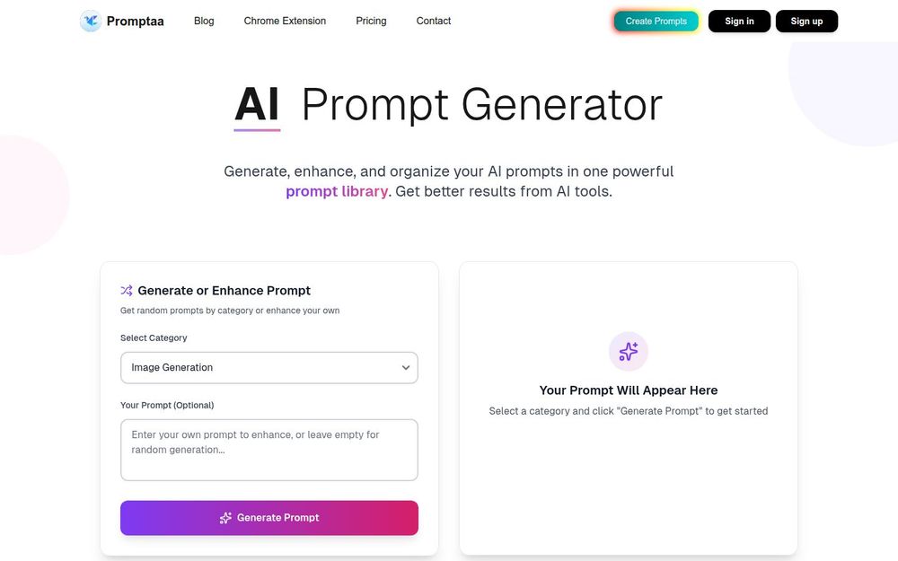 Promptaa 是一款专注于AI 提示词生成与管理的在线工具,旨在帮助个人与团队创建、增强并组织用于各种生成式 AI(如 ChatGPT、Claude、DALL·E、Midjourney 等)的高质量提示词。平台整合了随机生成、AI 增强、提示库管理与社区分享等功能,降低提示词工程门槛,提高产出一致性与效率。