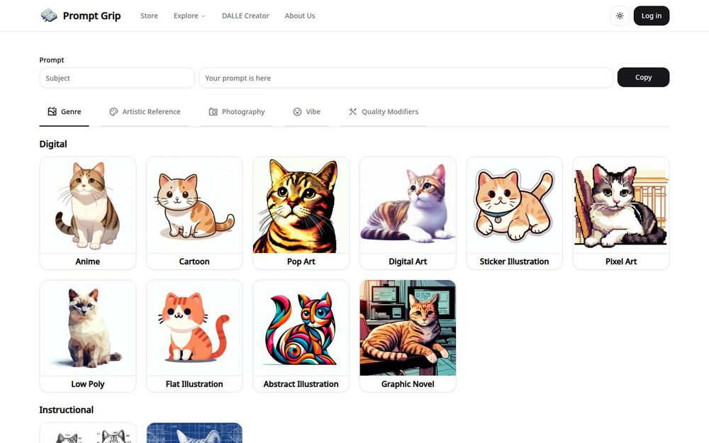 分类化提示库: 按 Genre(类型)、Artistic Reference(艺术参考)、Photography(摄影)、Vibe(氛围)、Quality Modifiers(质量修饰) 等多维度组织提示,涵盖数字艺术、教学图示、3D 渲染、文化风格与多种传统媒介。