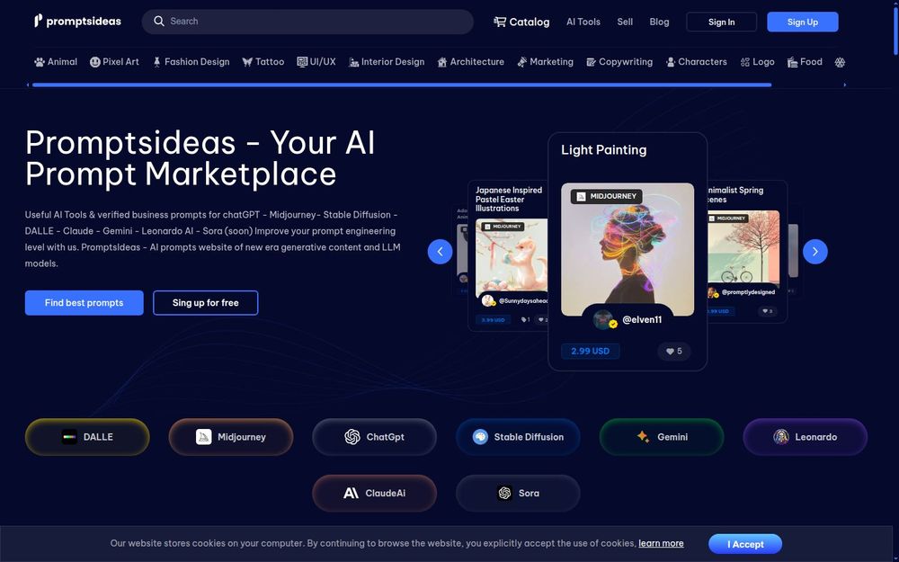 提示市场与交易: 一个可浏览、购买与出售提示的在线市场,覆盖图像(Midjourney、DALLE、Stable Diffusion、Leonardo 等)与文本(ChatGPT、Claude、Gemini、Sora 等)等多种模型。